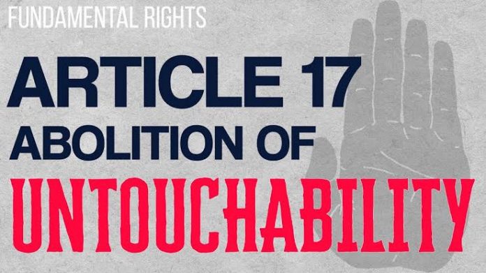 भारतीय संविधान का अनुच्छेद 17, जो मौलिक अधिकारों का हिस्सा है, यह प्रावधान करता है कि देश में सभी प्रकार की अस्पृश्यता समाप्त कर दी गई है, और यदि वे किसी भी रूप में प्रचलित हैं, तो वे कानूनी कार्रवाई का आधार बन सकते हैं। “किसी भी रूप में” शब्द का उपयोग समावेशी तरीके से किया जाता है, जिसका अर्थ है कि अस्पृश्यता का कोई भी और हर रूप निषिद्ध है। इस प्रकार, न केवल अछूत समुदाय के साथ अपमानजनक व्यवहार करना, जैसे कि उन्हें अलग क्षेत्रों में रहने के लिए मजबूर करना, निषिद्ध है, बल्कि ऐसे लोगों के संपर्क में आने के लिए किए जाने वाले शुद्धिकरण के समारोहों को भी समाप्त कर दिया जाना चाहिए।