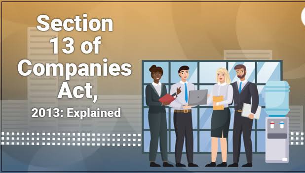धारा 13 के अनुसार, किसी कंपनी को अपने मेमोरेंडम ऑफ एसोसिएशन को बदलने के लिए एक विशेष प्रस्ताव पारित करने की आवश्यकता होती है। कंपनी के नाम में बदलाव या कंपनी के पंजीकृत कार्यालय में बदलाव की स्थिति में भी केंद्र सरकार की मंजूरी की आवश्यकता होगी। किसी कंपनी को कंपनी रजिस्ट्रार के पास विशेष प्रस्ताव और केंद्र सरकार की मंजूरी दाखिल करनी होती है।